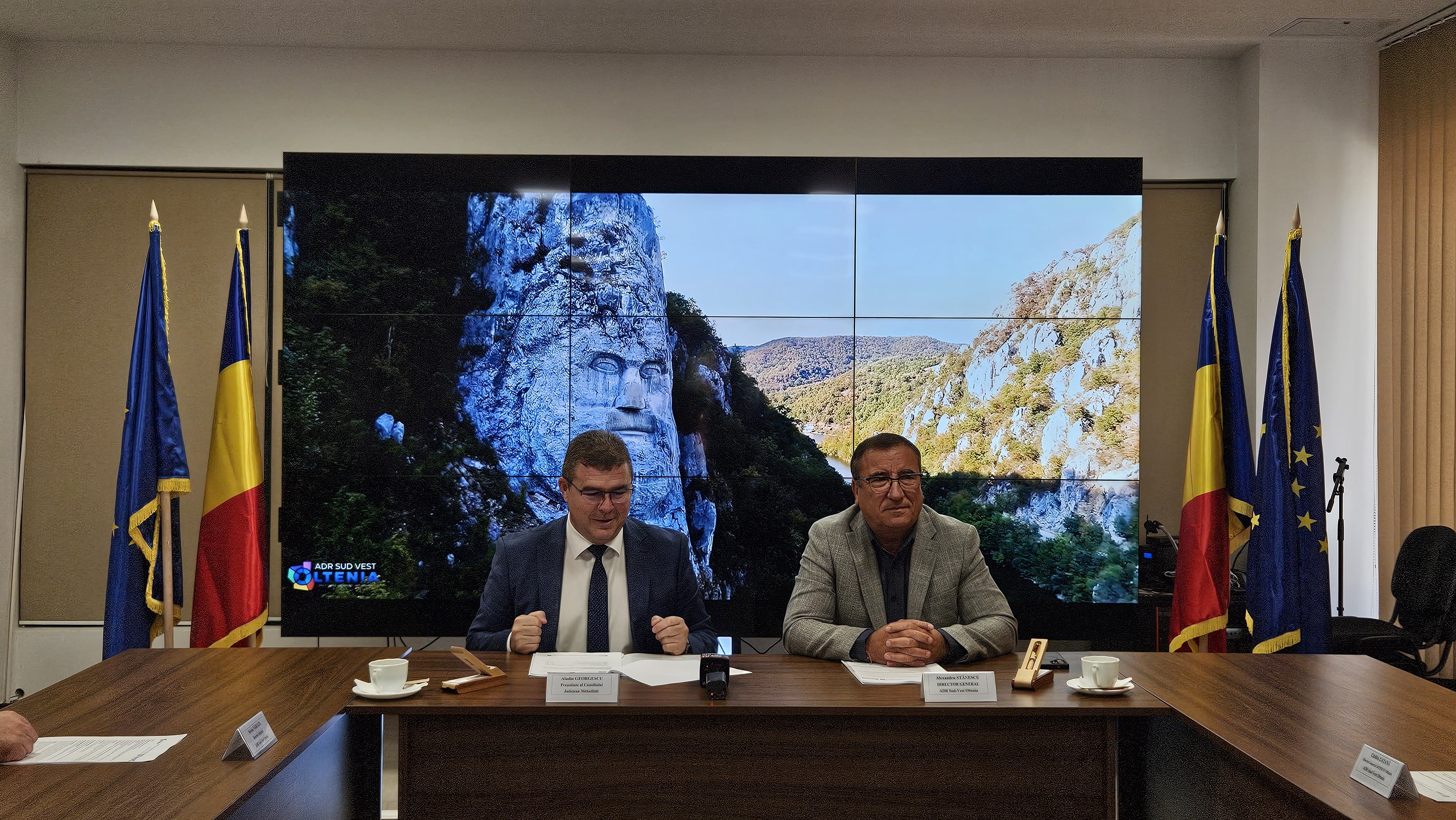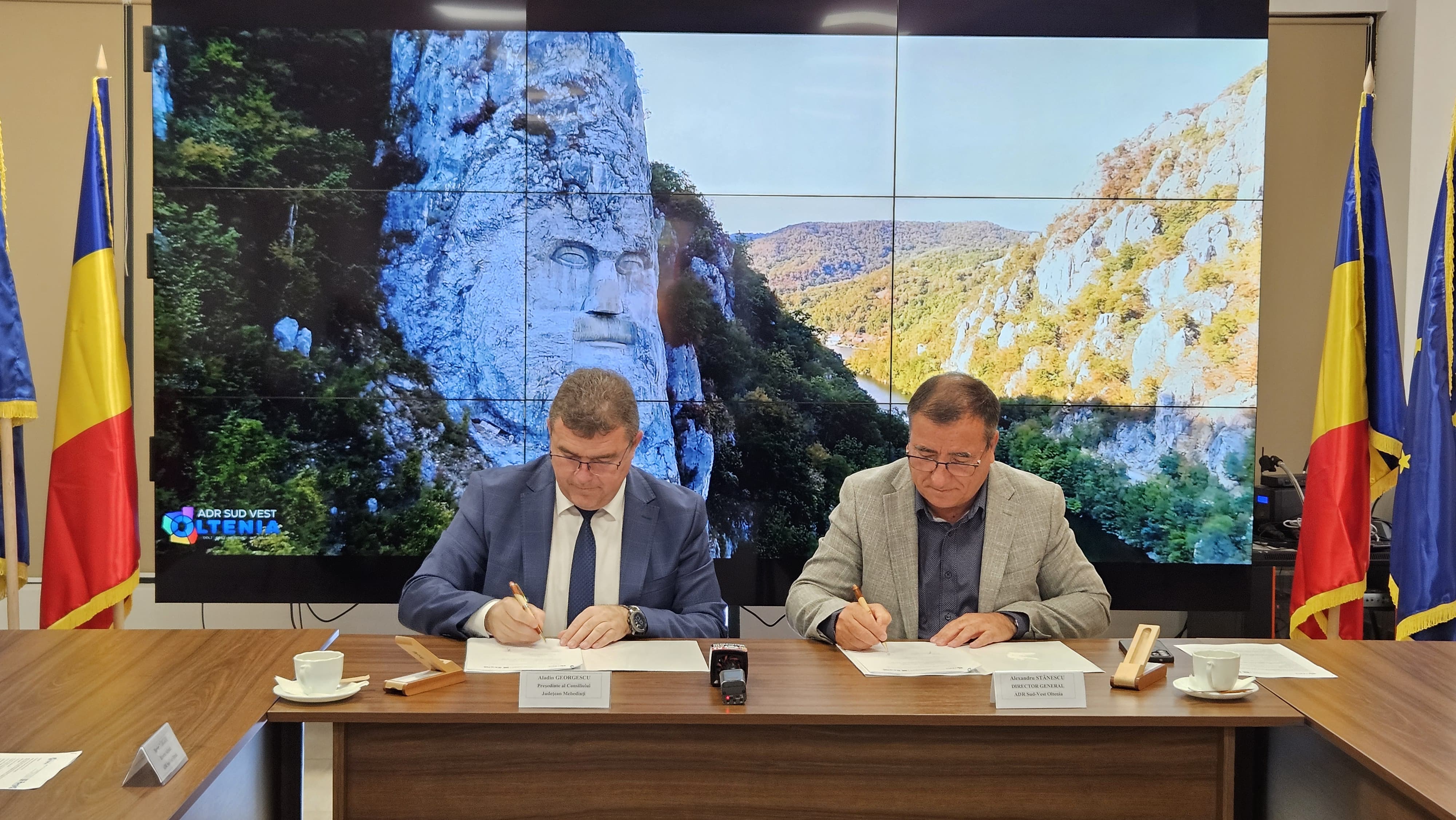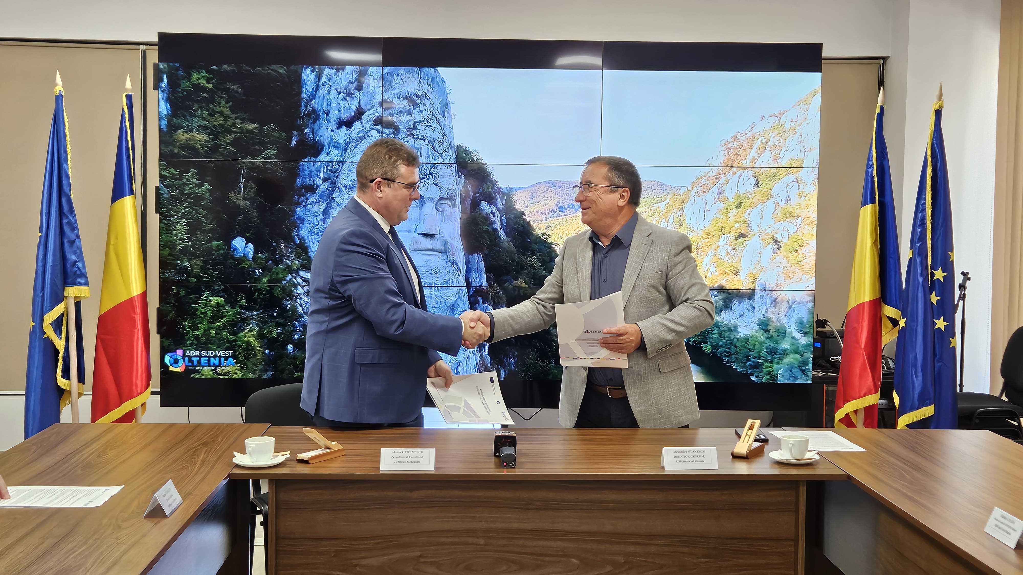 Contractul de finanțare a fost înmânat astăzi, 23 iunie, de către domnul Alexandru Stănescu, directorul general al ADR Sud-Vest Oltenia, domnului Aladin Georgescu, președintele Consiliului Județean Mehedinți. La eveniment au fost prezenți domnul Marius Vărgatu, directorul general adjunct al ADR Sud-Vest Oltenia, și domnul Cătălin Catană, directorul general al Autorității de Management pentru Programul Regional Sud-Vest Oltenia.